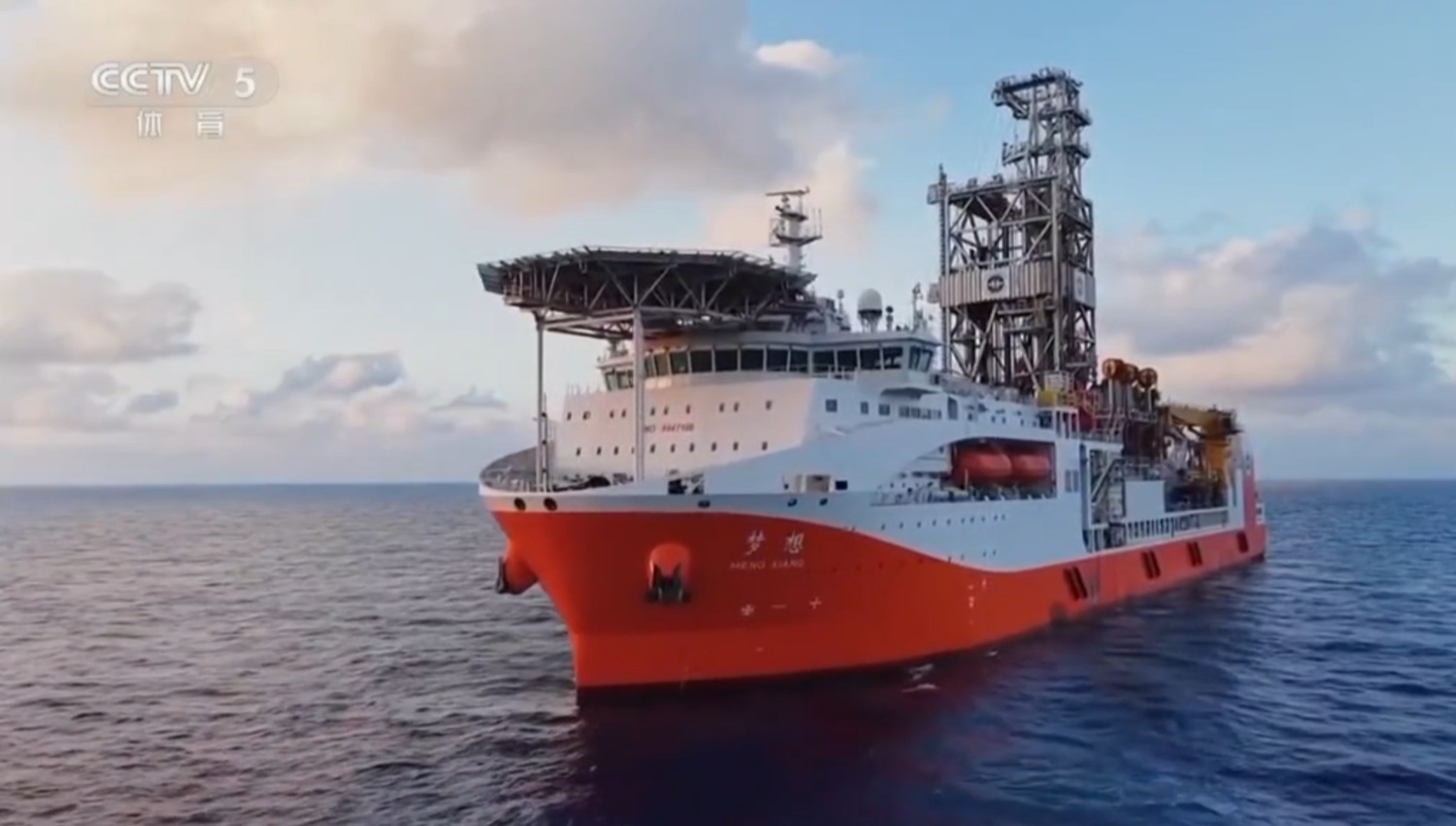 “梦想”号钻采船是我国首艘自主设计建造的大洋钻探船,于去年底建成并入列,具备海域11000米的钻探能力。截图来源:央视新闻客户端